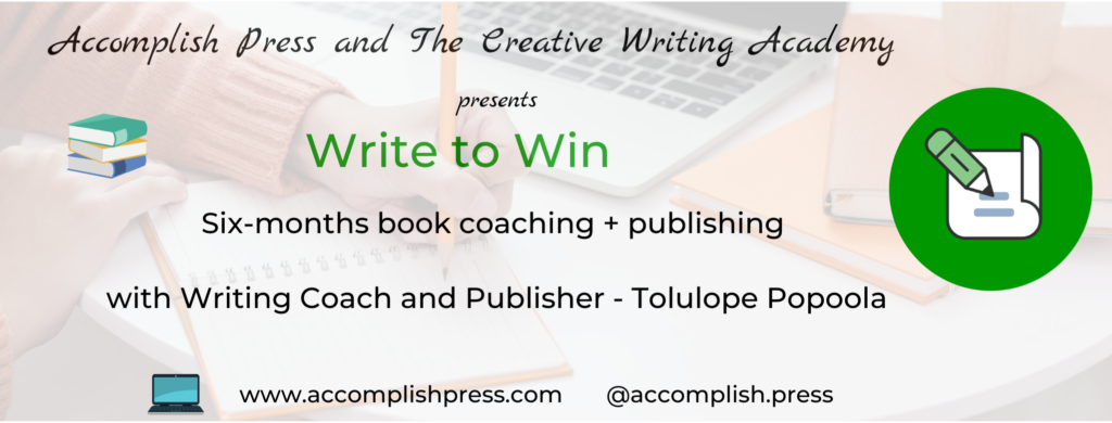 Hi! My name is Tolulope Popoola and I’m a Writing Coach and Publishing Consultant at Accomplish Press. I help aspiring authors to overcome their obstacles, clear their doubts and reconnect with their creative side, so that they can finally write and publish the book within them! I also help with structuring and publishing manuscripts after they’re done. I’ve been writing since I can remember, from when I was a little girl, about six years old. But I got teased in school by my friends who thought I was weird, so I stopped. However, I never lost my love for reading and I read anything I could get my hands on. I also continued to write in secret. I kept diaries and journals throughout my teen years, and writing was my therapy whenever I was upset.